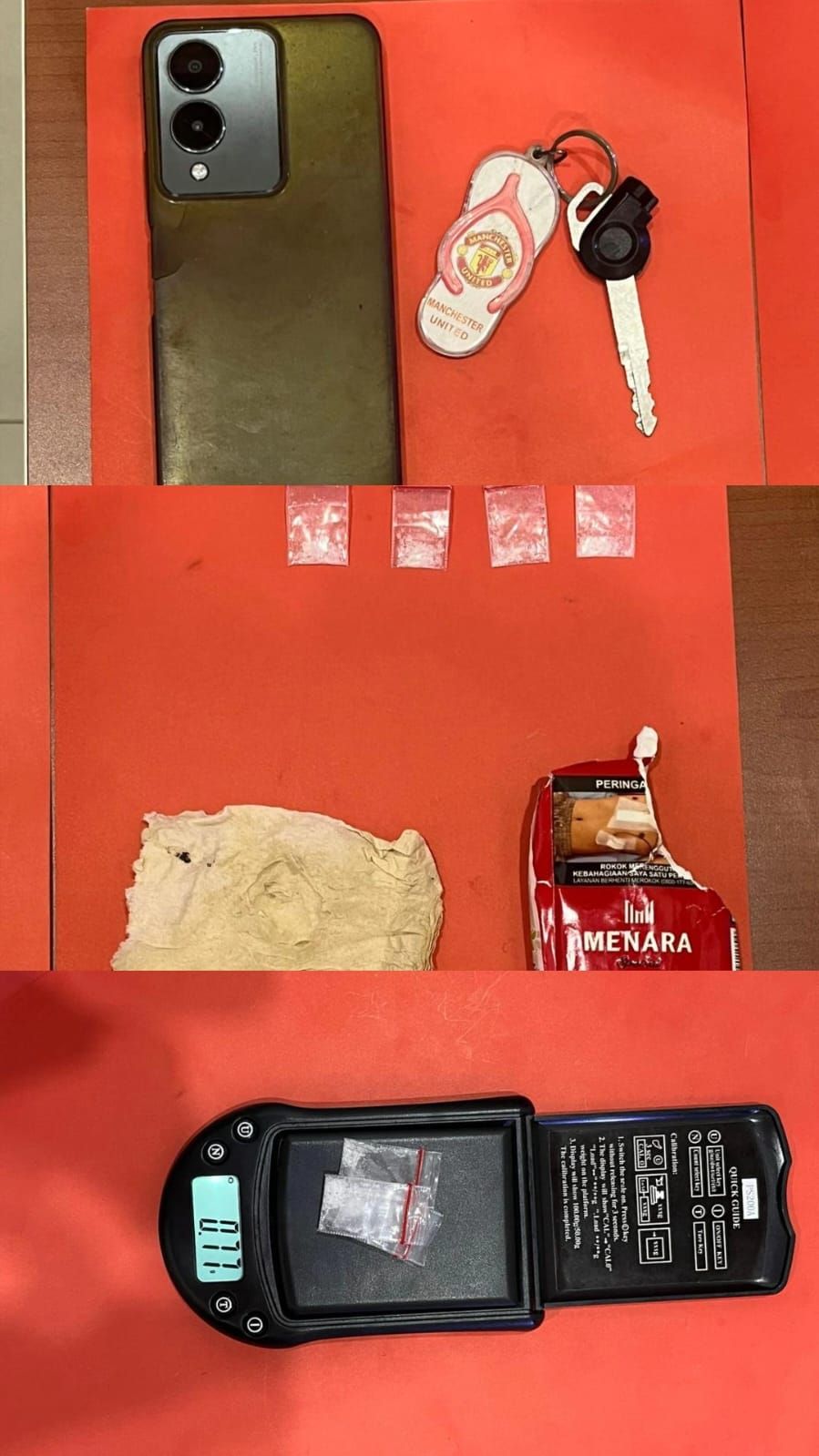 Dari tangan tersangka, petugas berhasil mengamankan 4 bungkus plastik klip berisi sabu, satu kotak rokok merek Menara yang dijadikan tempat penyimpanan, satu lembar kertas timah, sepeda motor Yamaha Mio warna putih, dan satu unit ponsel merek Vivo yang diduga digunakan untuk berkomunikasi dalam transaksi.